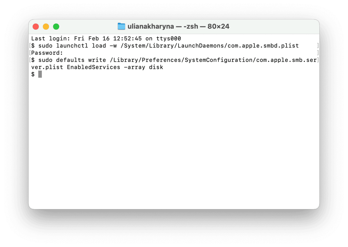 sudo launchctl load -w /System/Library/LaunchDaemons/com.apple.smbd.plistsudo defaults write /Library/Preferences/SystemConfiguration/com.apple.smb.server.plist EnabledServices -array disk