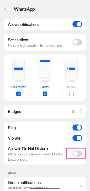 前往设置>应用程序>WhatsApp>管理通知然后打开“允许请勿打扰”旁边的切换开关。