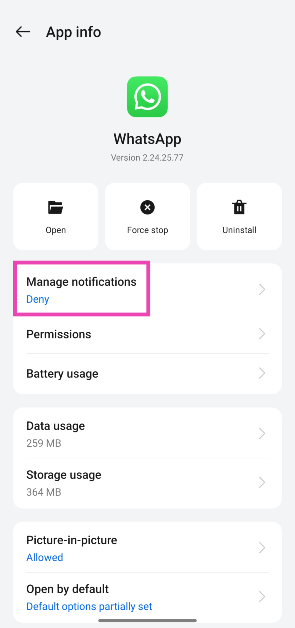 前往设置>应用程序>WhatsApp>管理通知然后打开“允许通知”旁边的切换开关。