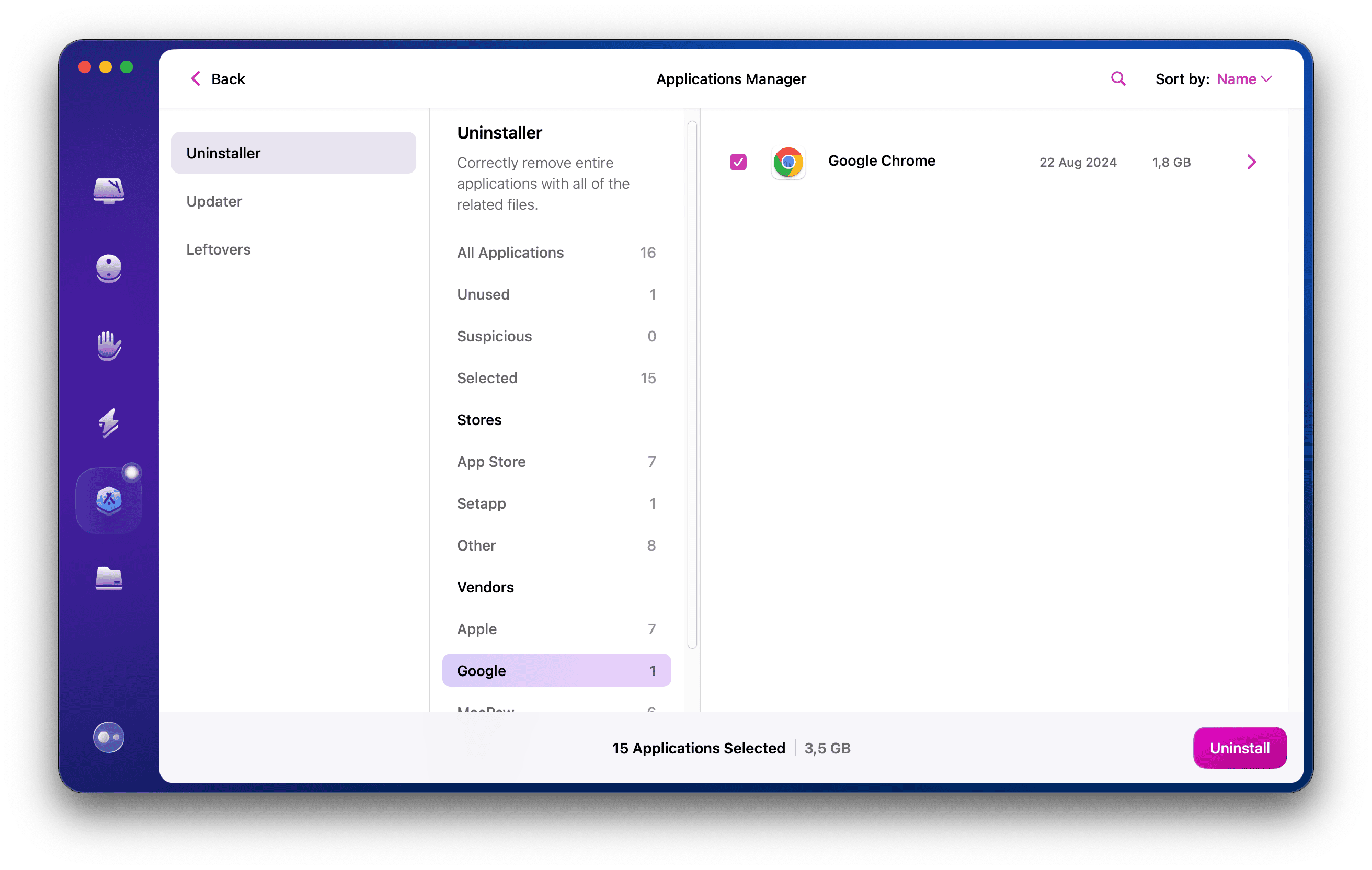 卸载它的最简单方法是使用专用卸载程序,例如 CleanMyMac。 CleanMyMac 还可以删除浏览数据并重置应用程序。以下是使用 CleanMyMac 卸载 Chrome 的方法: