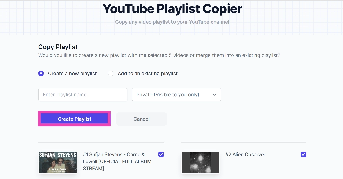 您也可以使用一些在线工具来完成此任务。但这涉及授予第三方工具访问您的 Google 帐户的权限。如果您对此不满意,请坚持第一种方法。但是,第三方工具可以轻松合并播放列表并选择您想要的内容。查看下面的两种方法,看看您更喜欢哪一种!