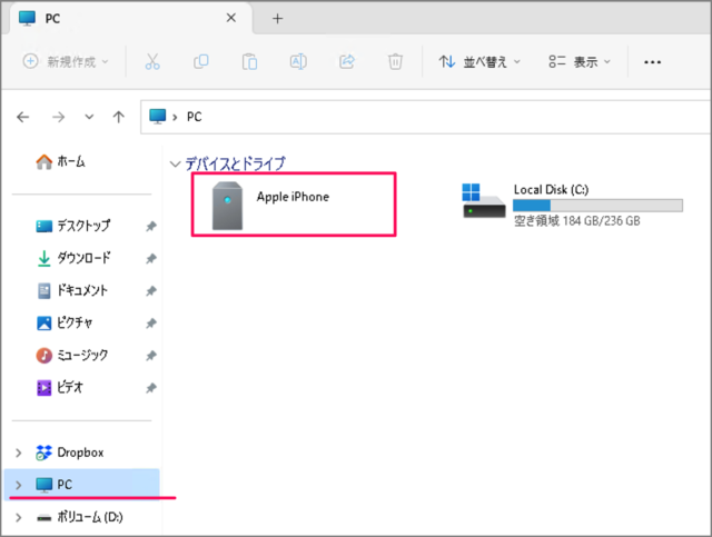 资源管理器启动后,转到左侧菜单中的[PC] → [Apple iPhone]。 -