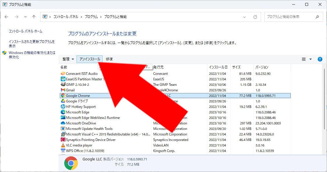 从列表中选择“Google Chrome”,然后单击顶部的卸载按钮。