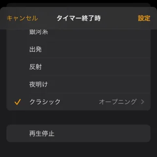 默认情况下,会选择一种名为 [Radial] 的声音,但这再生停止如果您选择 ,则行为将为“当剩余时间达到 0(零)时睡眠”。