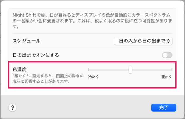 您还可以调整 Night Shift 的色温。将滑块向左移动可使其变冷,将其向右移动可使其变热。