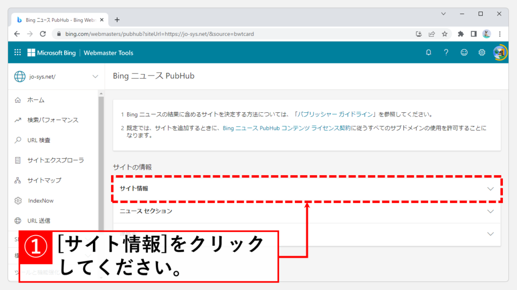 转到标有“Bing News PubHub”的页面点击【站点信息】请。
