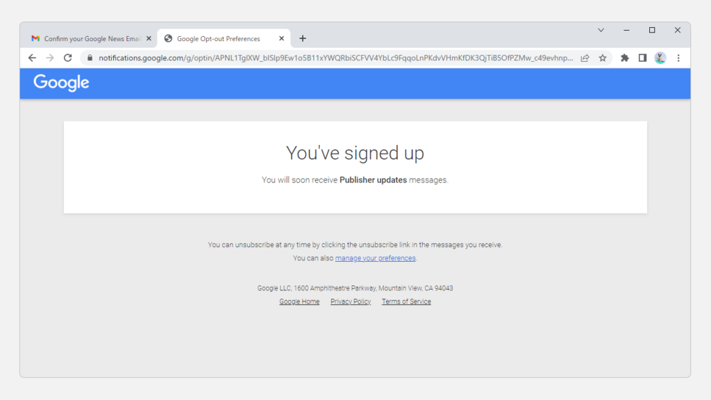 简而言之,类似于“感谢您订阅接收有关 Google 新闻技术问题(服务更新)的电子邮件。点击下面即可完成订阅。”
