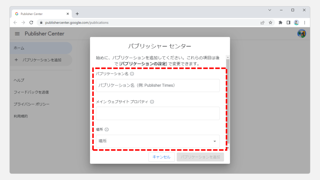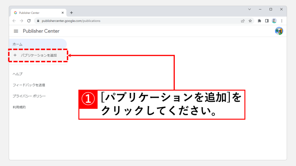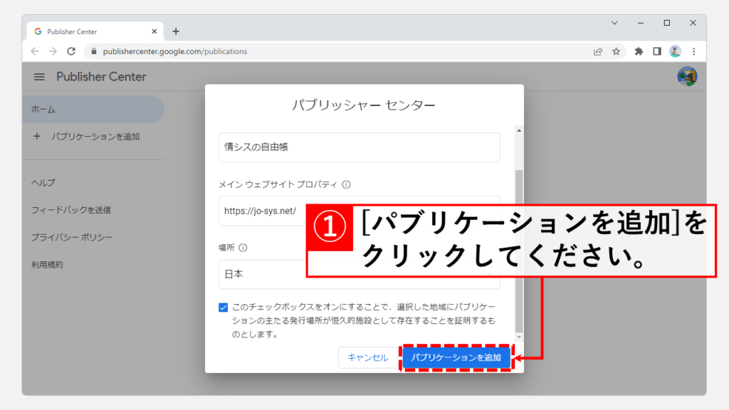 第一的出版商中心我将添加一个新出版物(我的网站)到 .