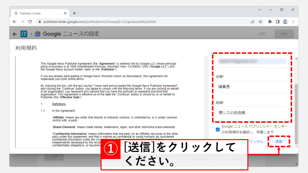 下一个选中“我已查看并同意 Google 新闻发布商中心服务条款”, 右下角点击【发送】请。