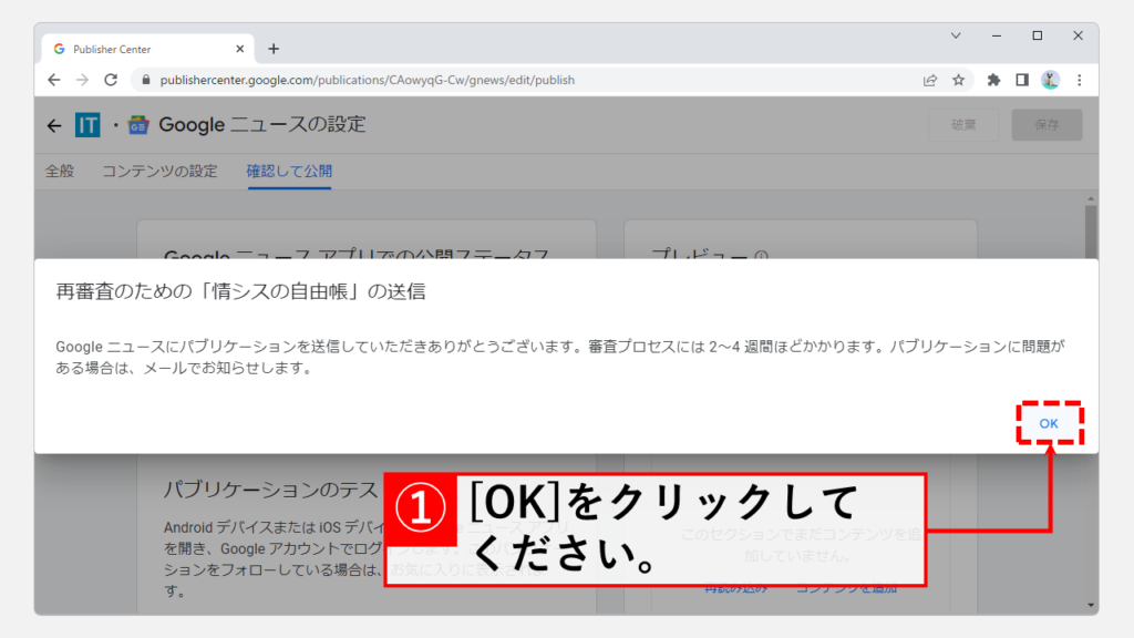 当您点击[发布]时,会出现一条消息,说明审核大约需要2到4周的时间。单击“确定”请。