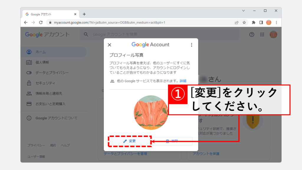 - 点击 Google 帐户欢迎页面上的图标,然后点击下一个屏幕上的“更改”