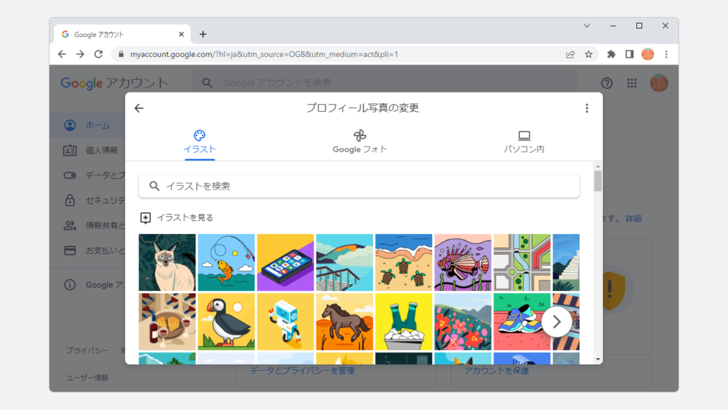 在“插图”中,有许多Google准备的插图,因此您可以从其中选择一张图像作为您的图标(个人资料照片)。