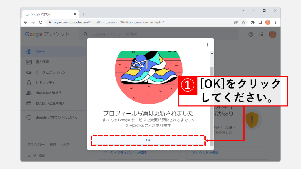 当您单击[删除]时,将出现一条消息:“您的个人资料照片已更新。”更改可能需要一两天的时间才能反映在所有 Google 服务中。”