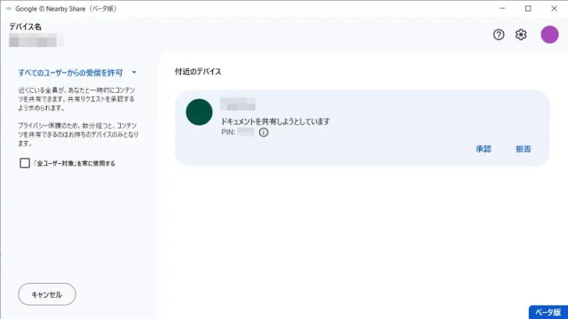 engrmemo.jp - 从快速共享(附近共享)中,检查[附近的设备(设备名称)],然后选择[批准]或[拒绝]。