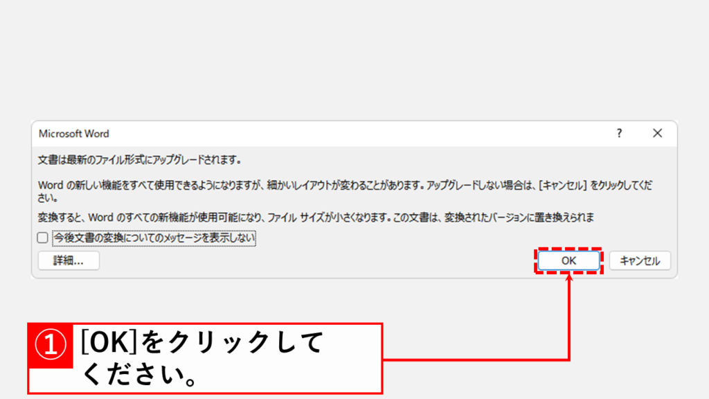 单击“转换”将打开一个窗口,其中显示消息“您的文档将升级到最新的文件格式。”