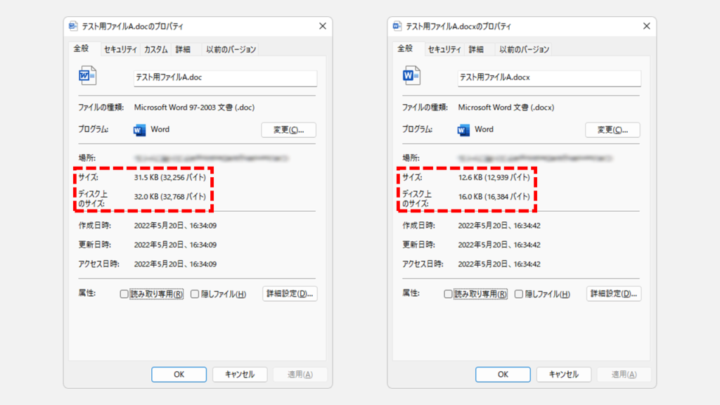 下面是将 .doc 格式(左)创建的文件转换为 .docx 格式(右)时文件属性的比较。