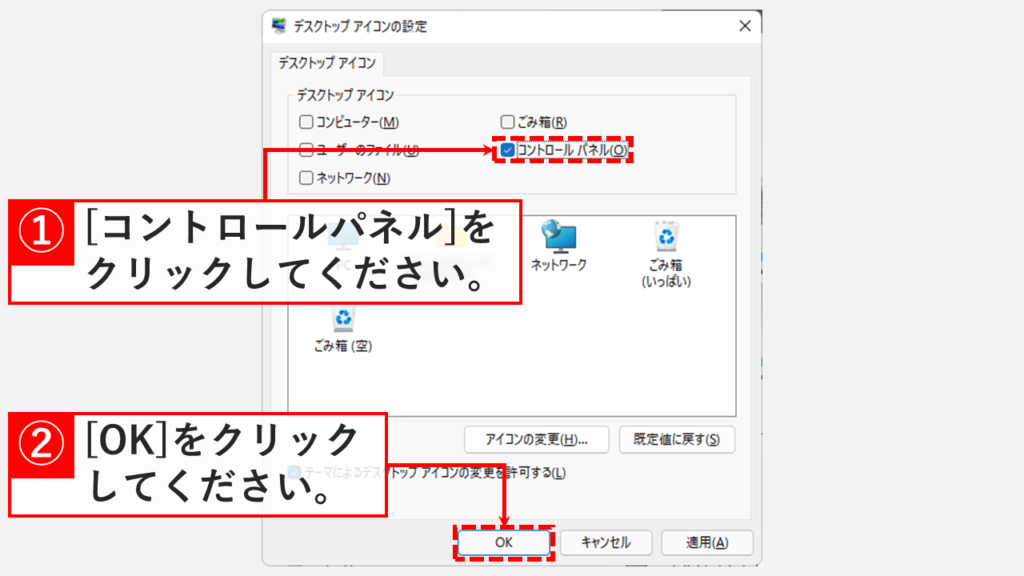 - 在“桌面图标设置”窗口中,勾选“控制面板”,然后单击“确定”