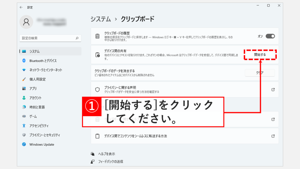 步在剪贴板设置屏幕上单击“在设备之间共享”的[开始]。