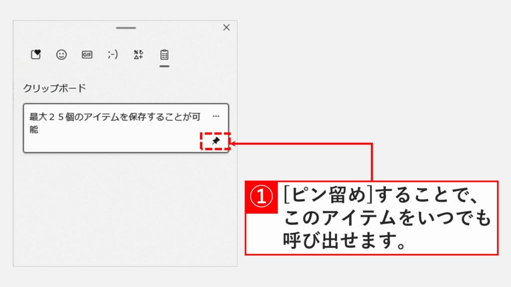 位于剪贴板窗口中任何项目的右上角。单击图钉标记这允许您将项目固定到剪贴板并将其保留在那里。