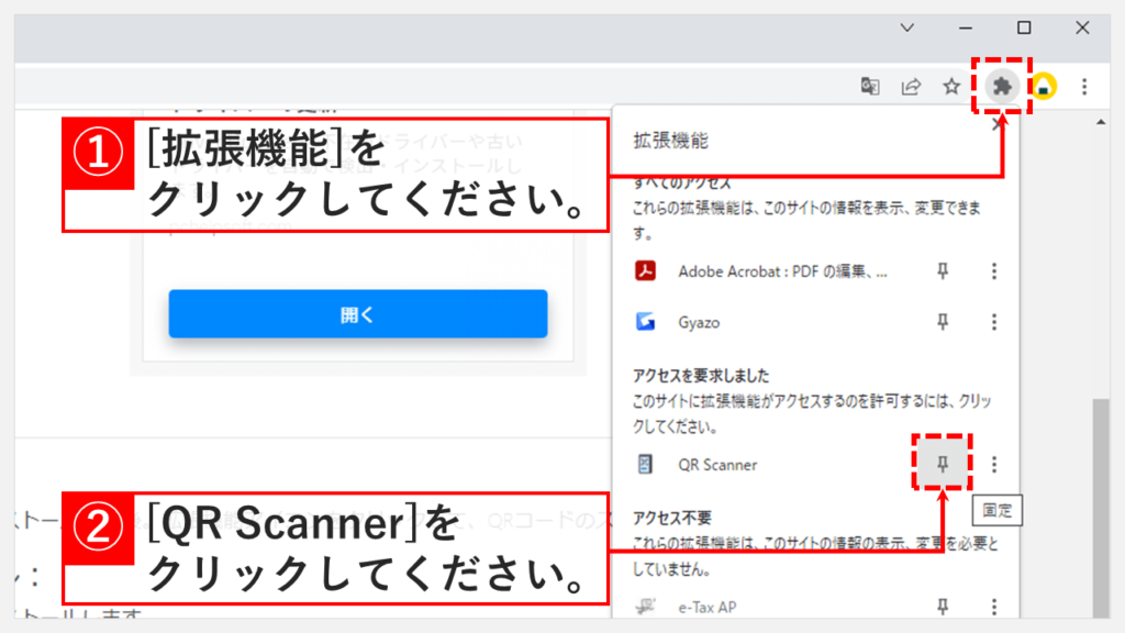 步当 Google Chrome 上显示 QR 码时,单击固定的“QR 扫描仪”图标