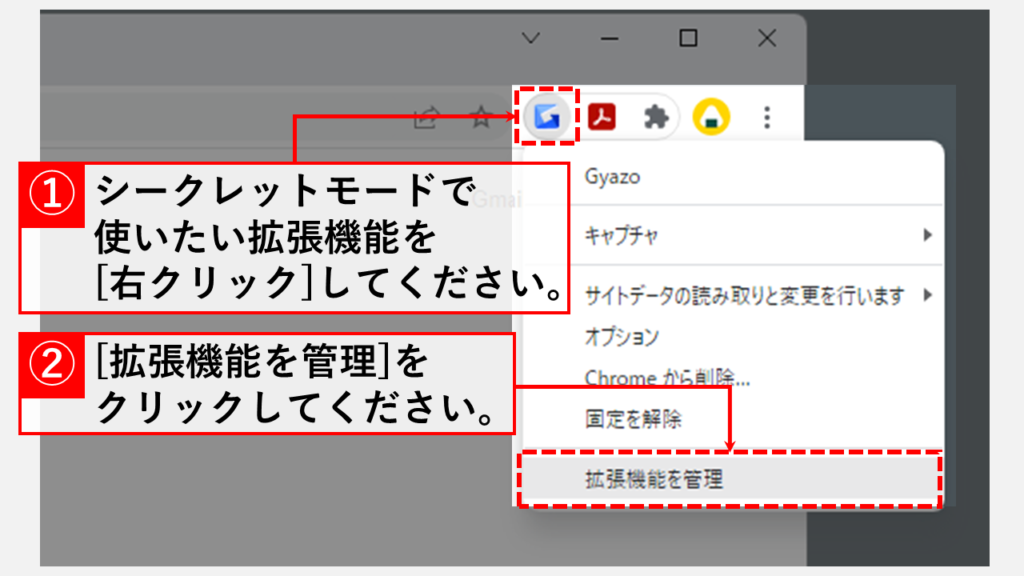 [右键单击]您要在隐身模式下使用的扩展程序图标,然后单击[管理扩展程序]