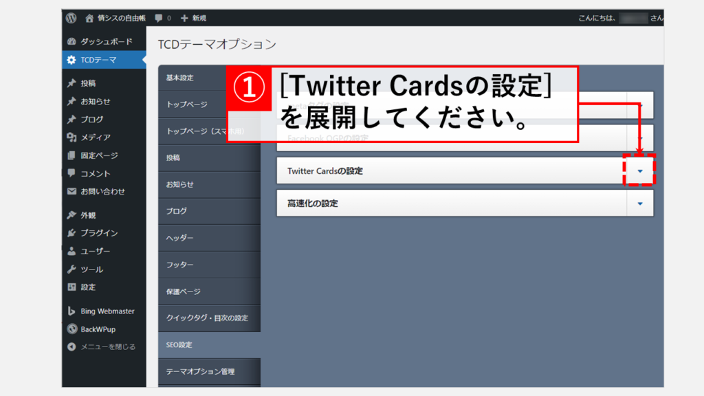 单击并展开标记为 TCD 主题选项的页面上的 SEO 设置中的 Twitter 卡设置。