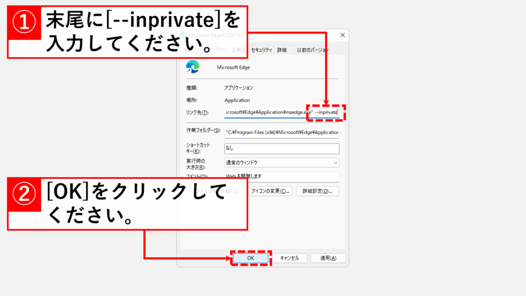 在标有 [Link (T)] 的框末尾插入一个半角空格,然后输入 [–inprivate]。