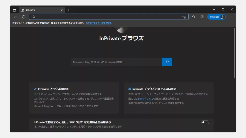 如果您单击[InPrivate 窗口],然后出现如下所示的黑屏,并显示“InPrivate 浏览”,则您已成功。