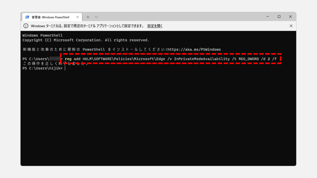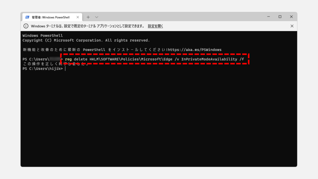 在这种情况下,如果您使用管理员权限运行以下命令,则设置(Microsoft Edge 注册表)可能会得到纠正,并且您可能能够再次打开 InPrivate 窗口。