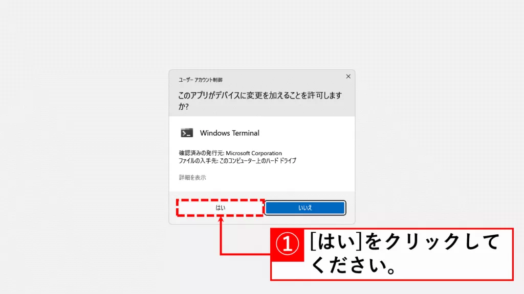 单击[终端(管理员)],将弹出一个标有“用户帐户控制”的窗口。