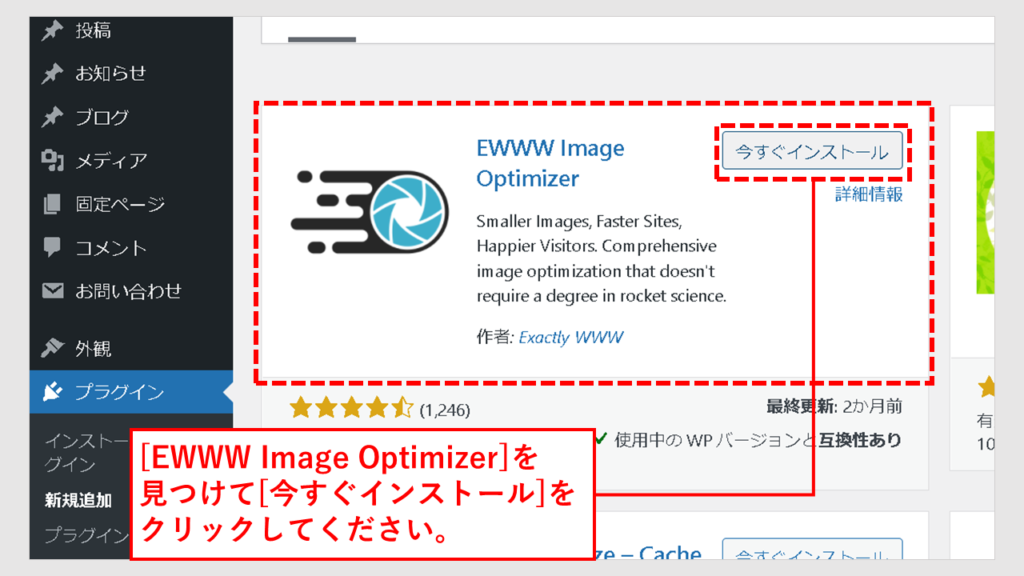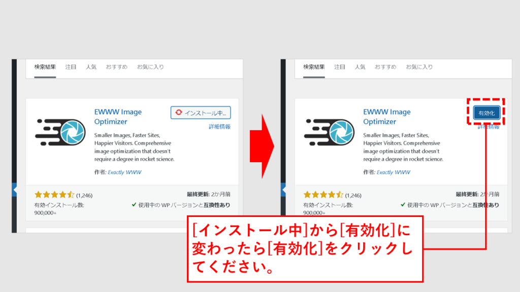 单击“立即安装”,EWWW Image Optimizer 的状态将更改为“正在安装”。