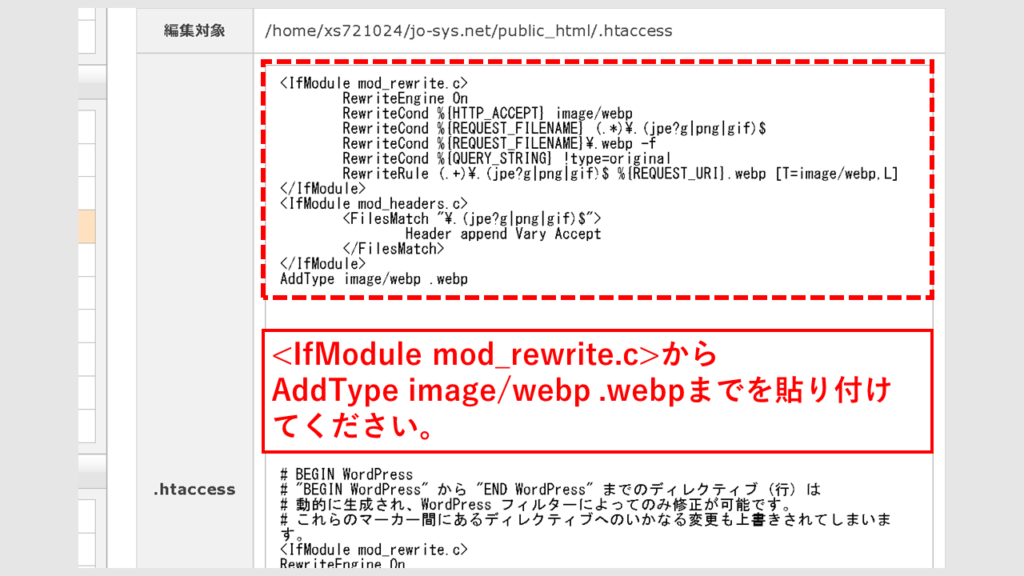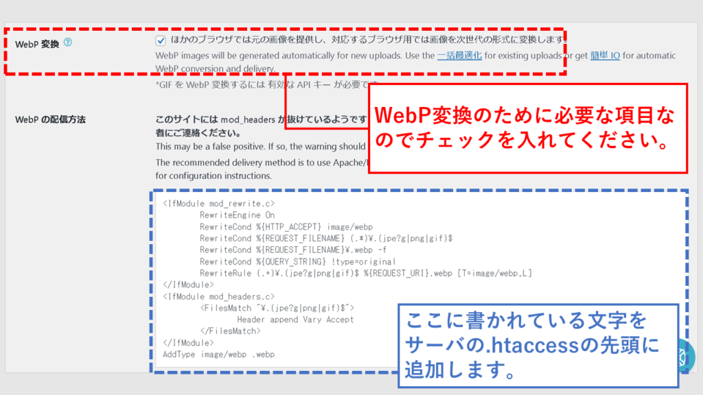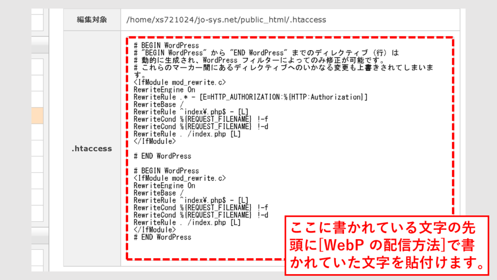 在[Webp交付方式]下,将以下字符用蓝框括起来的代码添加到租赁服务器等上的.htaccess的开头。