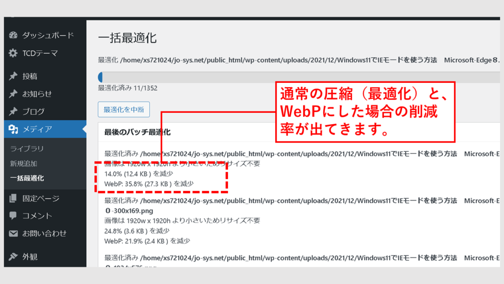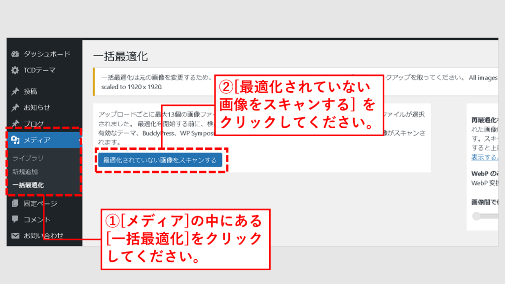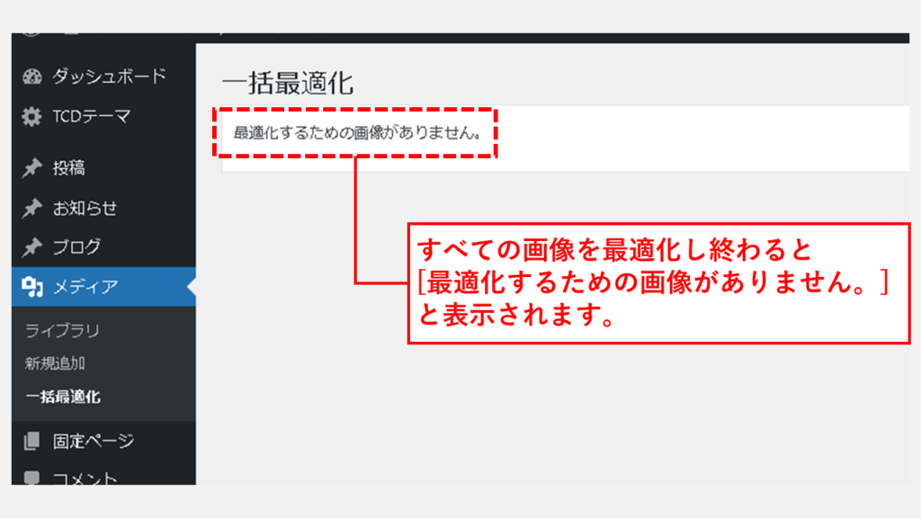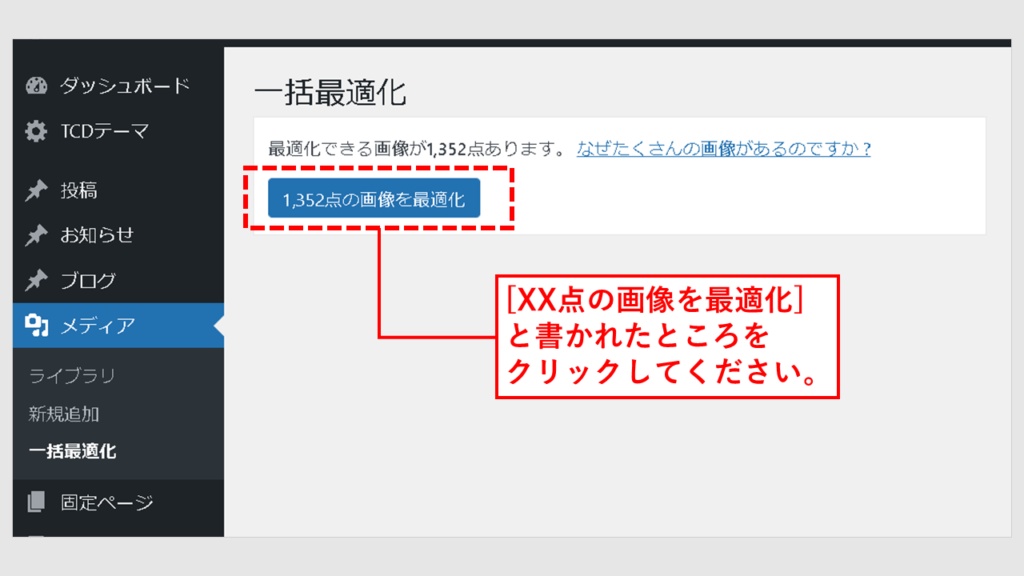 单击WordPress管理屏幕右侧菜单中[媒体]下的[批量优化]。
