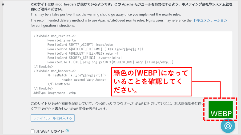 即使出现此消息,只要 EWWW Image Optimizer 设置屏幕的右下角有一个绿色的 [WEBP] 图像,就没有问题。