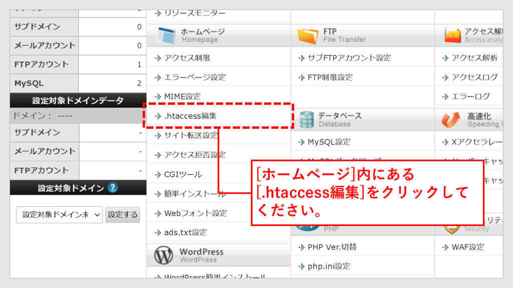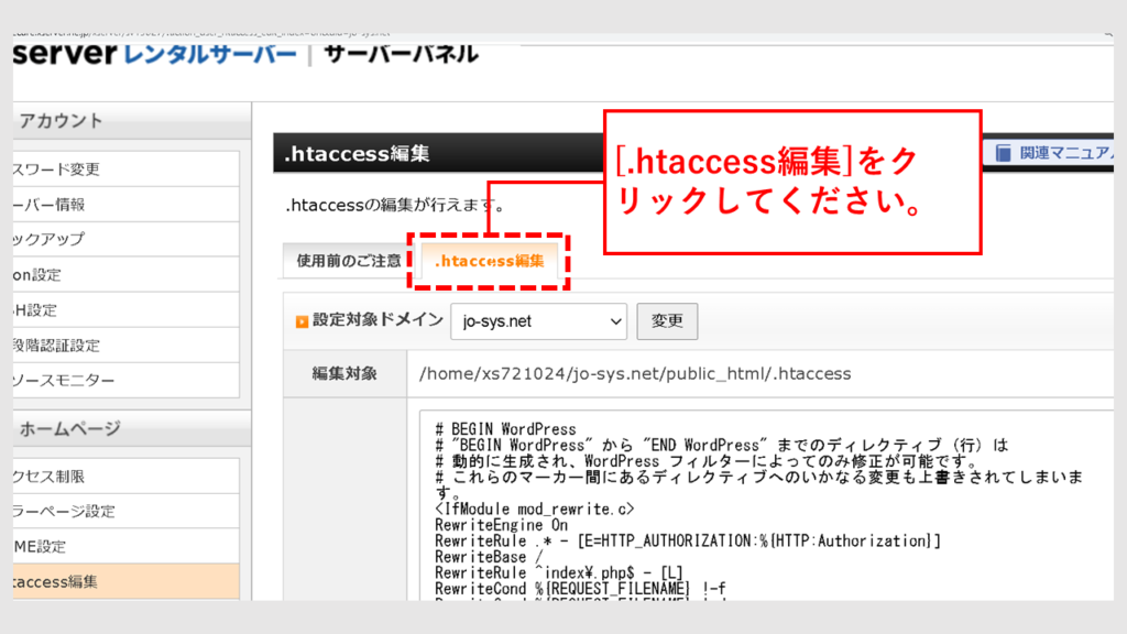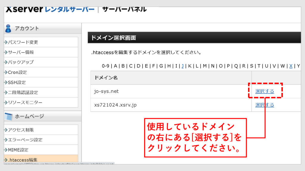 单击[编辑.htaccess]以显示[域选择屏幕]。