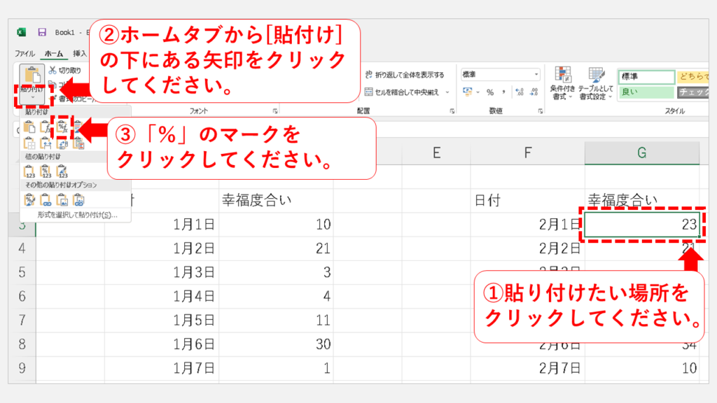 在该菜单的[粘贴选项]中有一个[%]标记,所以点击它请。