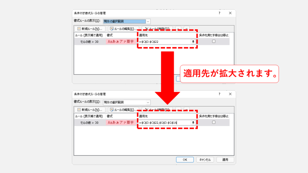 成功扩展范围后,使用“应用”→“确定”关闭标记为“管理条件格式规则”的窗口。