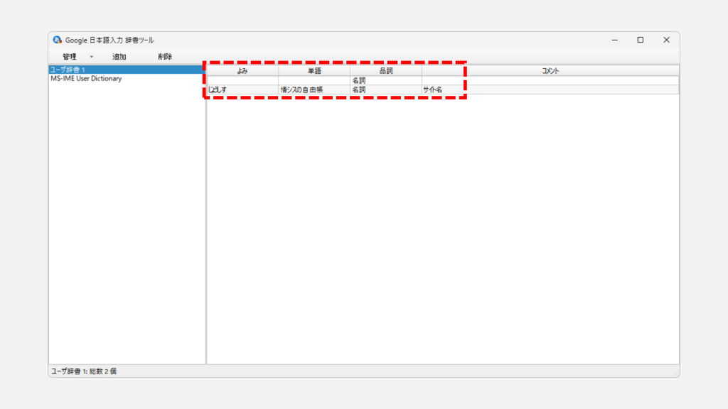 当您单击[编辑用户词典...]时,将出现一个标有“Google 日语输入词典工具”的窗口。