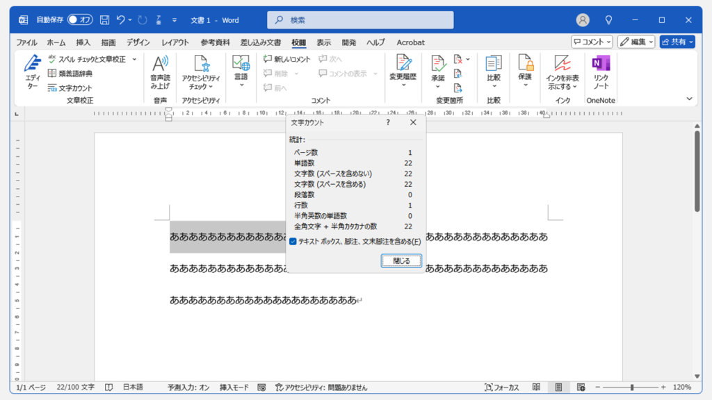 单词数和字符数相同,但这是因为 Word 规范将平假名、汉字和片假名等全角字符视为 1 个字符 = 1 个单词。