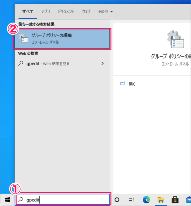 ① 输入“gpedit”,然后单击 ②“编辑组策略”。