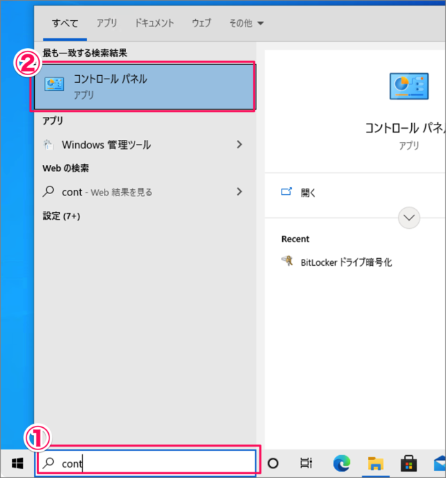 ① 在搜索框中输入“cont”,然后单击 ②“控制面板”。