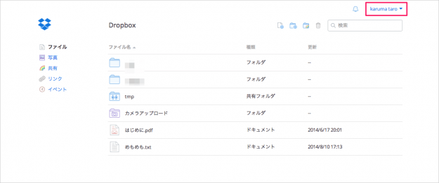 登录后,将显示文件夹和文件列表,因此请单击屏幕右上角的用户名。
