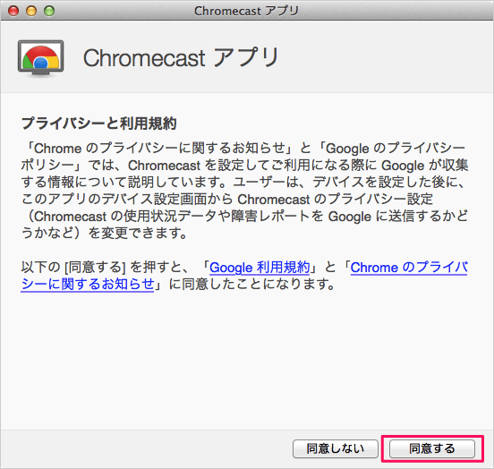 随后将启动“Chromecast 应用程序”窗口,并显示隐私和服务条款,因此单击“同意”。
