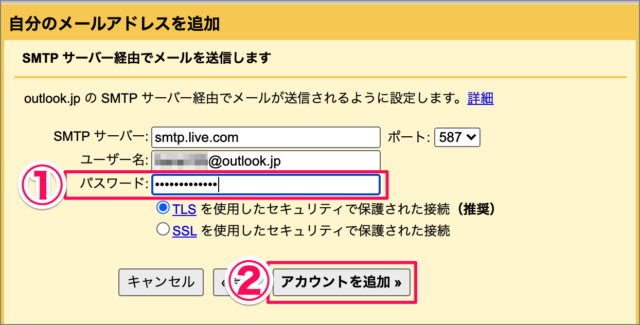 通过 SMTP 服务器发送电子邮件。 ①输入“密码”,②“添加帐户”。