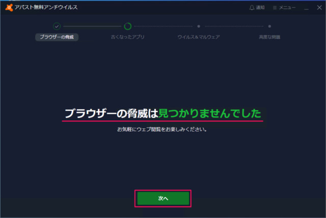 浏览器威胁扫描。如果显示“未发现浏览器威胁”,则没有问题。单击“下一步”。