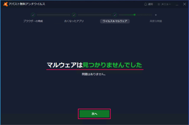 病毒和恶意软件扫描。如果显示“未发现恶意软件”,则没有问题。单击“下一步”。
