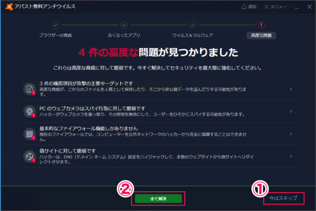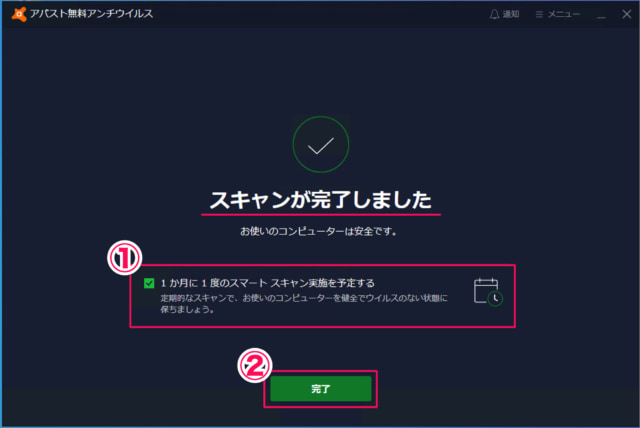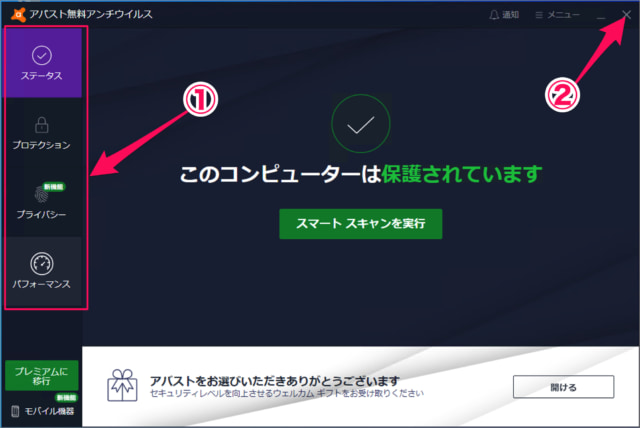 Avast 免费防病毒软件。 ① 检查完左侧菜单中的项目后, ② 单击右上角的“X”。