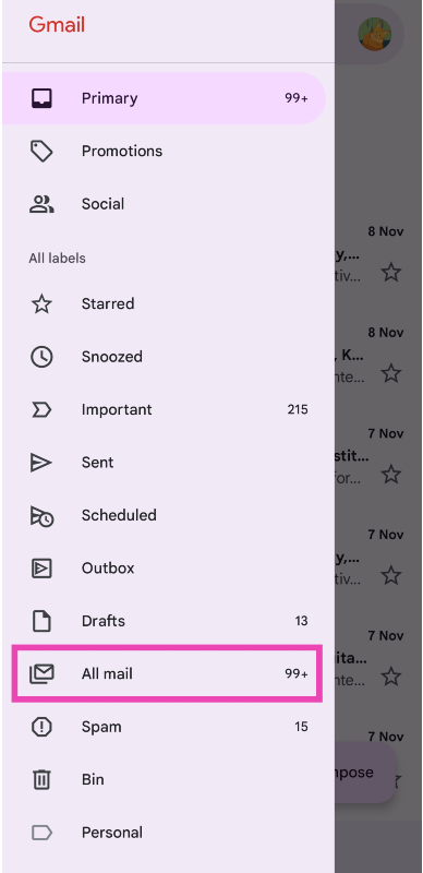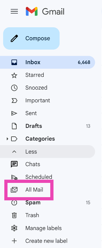 Gmail 沒有專用的存檔文件夾。要查看存檔的電子郵件,您需要從側面菜單訪問“所有郵件”文件夾。