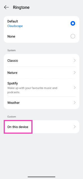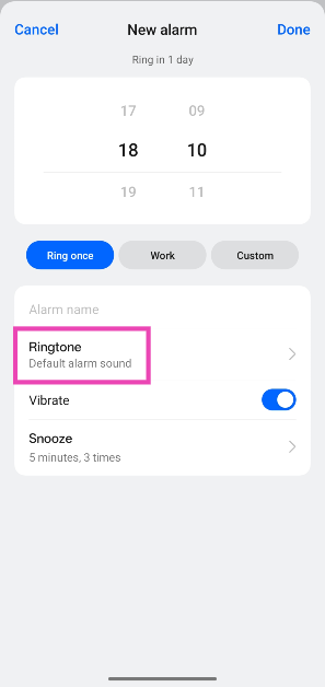轉到時鐘應用程序,點擊加號圖標創建鬧鐘,設置時間,然後點擊“鈴聲”。點擊“在此設備上”,然後選擇要設置為鬧鐘鈴聲的歌曲。