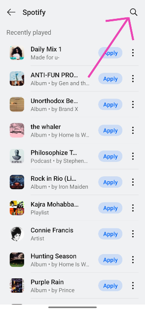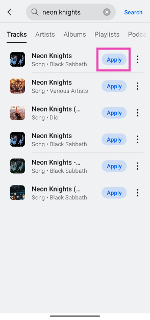 第6步:擊中搜索圖標屏幕右上角可搜索歌曲。或者,您可以點擊申請在建議的歌曲旁邊,將其設置為鬧鐘。